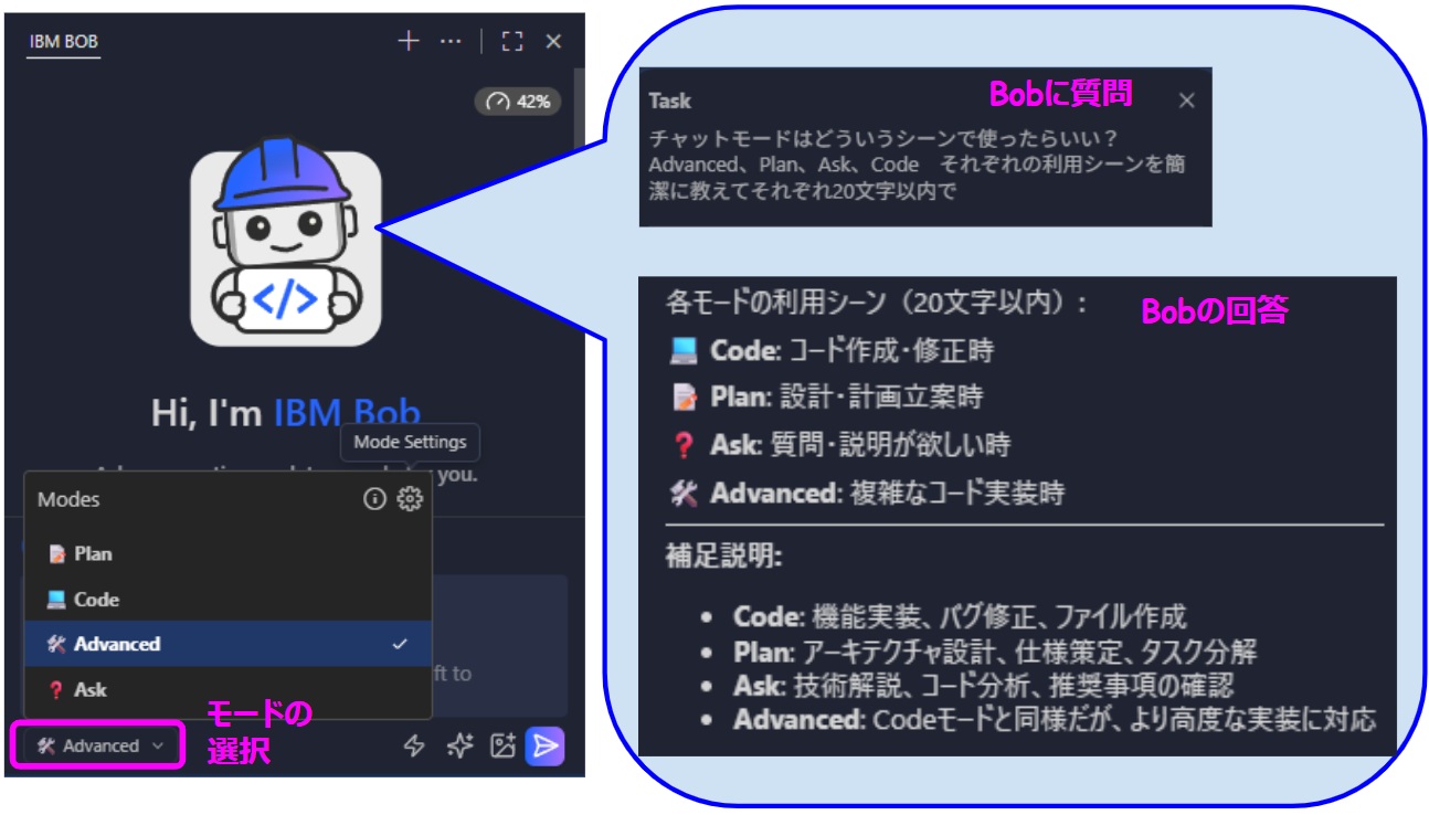 また、Bobのチャット画面で、回答の精度を最大化するために、チャットモード(※)を切り替えた検証も行っており、Bobと対話しながら特定箇所を修正・作成することも試行しています。