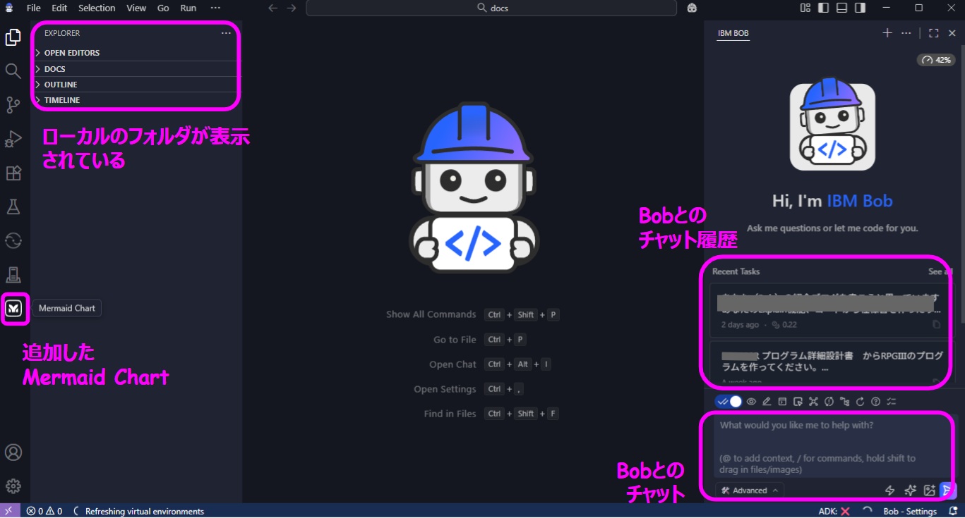 環境拡張: Bob内のメニュー「Extensions」から「Mermaid Chart」のPluginを導入。出力された構成図(Mermaid形式)をより視覚的に確認できる環境を準備。