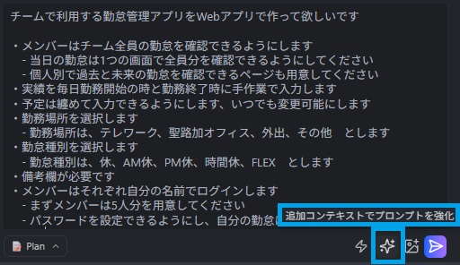 「プロンプト強化機能」を利用することで、説明が不足している部分をBobが具体的に補完し、精度の高いプロンプトへとブラッシュアップしてくれます。