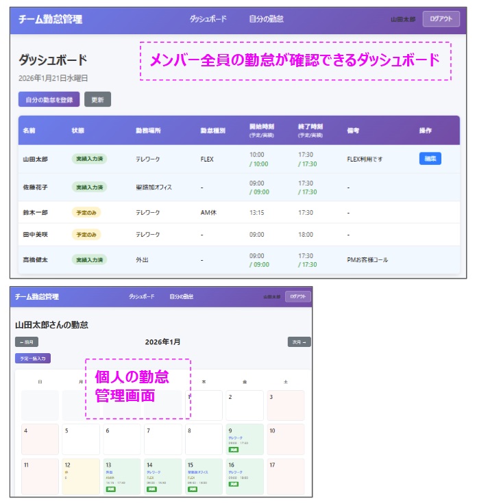 | チーム向け勤怠管理Webアプリケーションを以下の仕様で開発してください。 【基本機能】 メンバー全員が互いの勤怠状況を閲覧可能なチーム勤怠管理システムを構築します。 各メンバーは個人アカウントでログインし、自分の勤怠データのみ編集権限を持ち、他メンバーのデータは閲覧のみ可能とします。 【画面構成】 2. 個人別勤怠カレンダー画面:メンバーごとに過去の勤怠実績と未来の勤怠予定を時系列で確認・管理できるページを用意し、日付範囲を指定して表示できるようにします 【勤怠データ入力機能】 【勤務場所の選択肢】 【勤怠種別の選択肢】 【備考欄】 【認証・権限管理】 【技術要件】 |