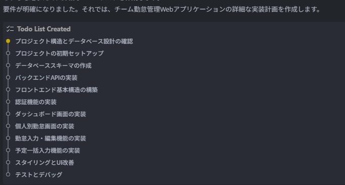 「1.プロンプトの強化」にて、プロンプトを強化してからアプリケーションを作成する方法を記載しましたが、試しに、プロンプトは強化せずに「出退勤管理アプリ」を作成してみました。
