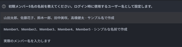 初期メンバー5名の名前を教えてください。ログイン時に使用するユーザー名として設定します。