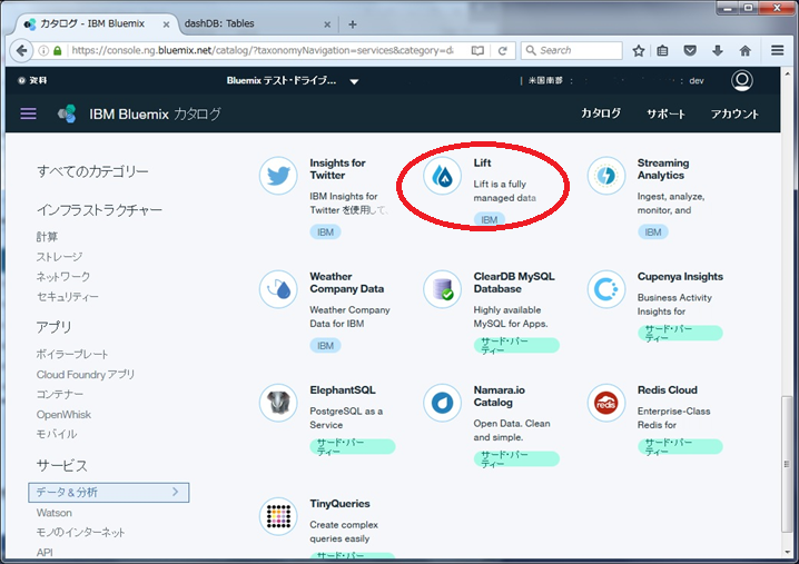 ・Bluemixのカタログから「Lift」サービスを選択します。(「データ&分析」サービスのところにあります)