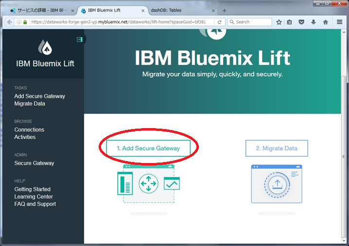 ・「1. Add Secure Gateway」ボタンを押します。