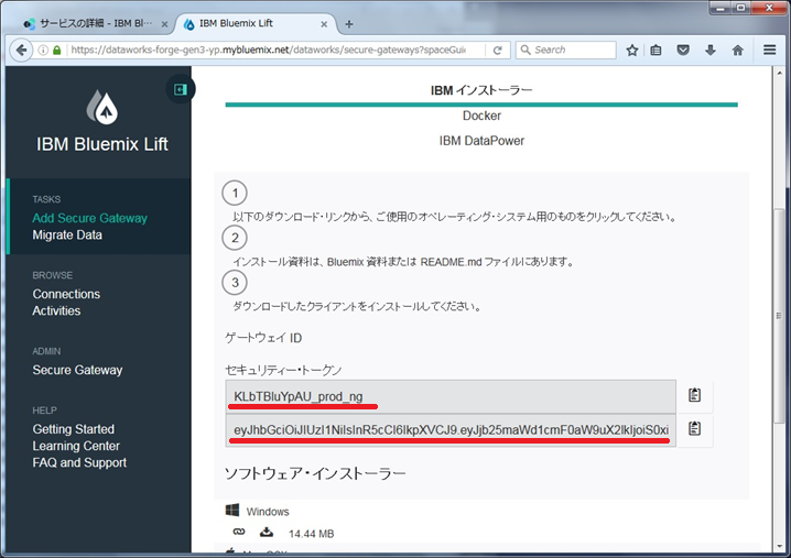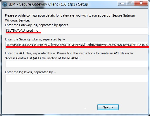 ・Secure Gatewayの「ゲートウェイID」と「セキュリティ・トークン」を聞かれますので、先ほどコピー&ペーストしたものをそれぞれ貼り付けて「Next」ボタンを押します。