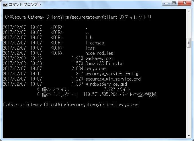 左記の手順でインストールした先のディレクトリ下の「ibm\securegateway\client」ディレクトリへ移動し、以下のコマンドを実行します。