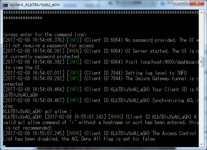 Secure Gatewayを起動したコマンドプロンプトで、「acl allow :」コマンドを実行します。(ここでは全ての接続を許可します)