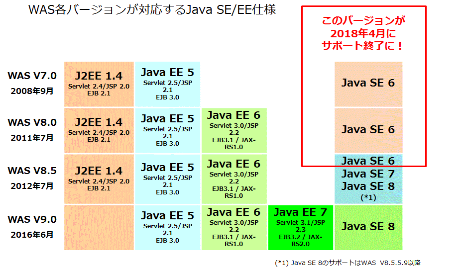 Java SEの最新バージョンは8ですので、下図のように古いバージョンのWASをお使いであれば、是非バージョンアップのご検討に入っていただきたいと思います。