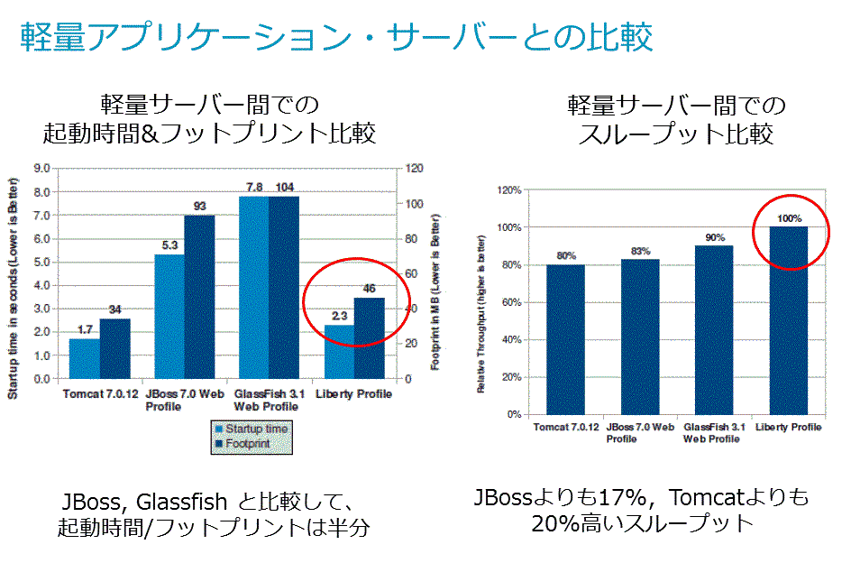 また、右のグラフでは、Libertyランタイムはどの製品よりも性能(スループット)が高く、Tomcatより20%も性能が高いことがわかります。