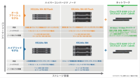 リモートオフィス/ブランチオフィス(ROBO: Remote Office and Branch Office)向けに設計されたシンプルなソリューションで、HX220ハイブリッドモデル3ノード構成。FIなしで1Gbネットワークが利用可能。ただし、拡張はできません。