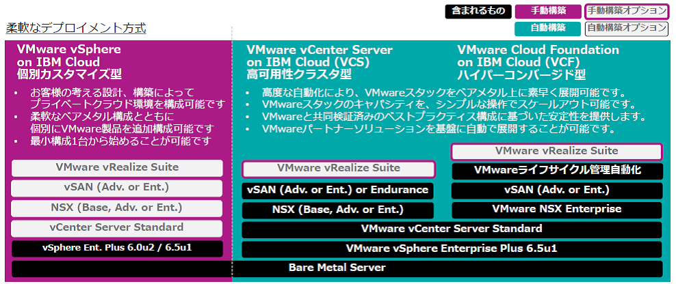 上図のように、VMware on IBM Cloudでは、要件や規模に応じて3種のデプロイメント方式が用意されています。