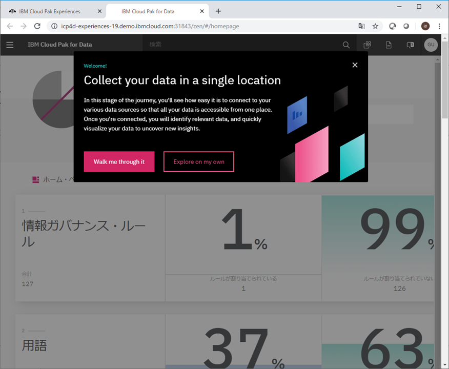 IBMが提供しているトライアル環境として Cloud Pak Experiences があります。このサイト上から、ICP4Dや他のCloud Pakシリーズ製品の実際の画面を利用することができます。