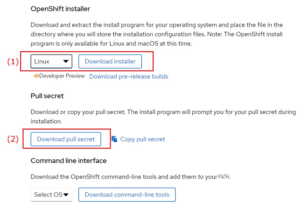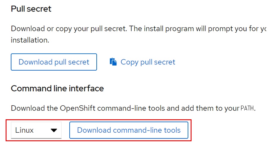 <OpenShift Installer、Pull secretをダウンロードしたページにて、「Command-line interface」項目からOSとして「Linux」を選択し、「command-line tools」をダウンロードします。>