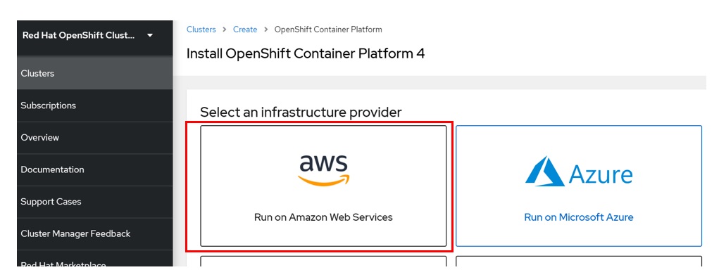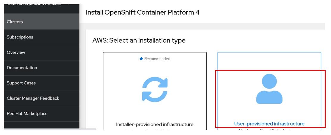 <作業用Linuxマシンにて、Red Hat OpenShift Cluster Manager サイトの「Infrastructure Provider」ページから「AWS」-「User-Provisioned Infrastructure」を選択し、(1)OpenShift installer と(2)Pull secret をダウンロードし “oc42ディレクトリ” に配置します。>