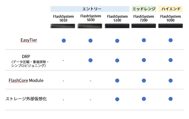 IBM FlashSystem のラインナップは、エントリーモデル(5010/5030/5100)、ミッドレンジモデル(5100/7200)、ハイエンドモデル(9200)と幅広く展開され、様々な要件に対応できます。上述の FCM を選択できるのは5100以上のモデルとなりますが、そのほかはデータ圧縮や重複排除など必要な機能と、性能要件をベースに選定すれば問題ありません。