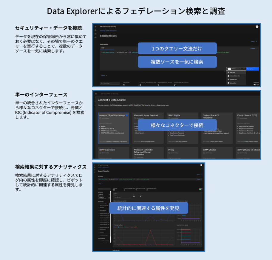 ICP for Security は、オンプレミスやパブリック/プライベートクラウドが混在する複雑な IT 環境下でも、様々なログやデータソースに1つの画面から「横串通し」にアクセスすることができます。