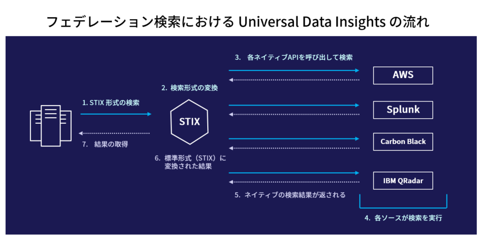 今までは統合ログストレージへデータを収集し分析することが主流でしたが、ICP for Security が構築するセキュリティ・エコシステムは統合ログストレージへデータを集めません。逆に ICP for Security から各種データソースにアクセスすることで、最新のログを対象にした高速検索を可能にしています(フェデレーション検索)。