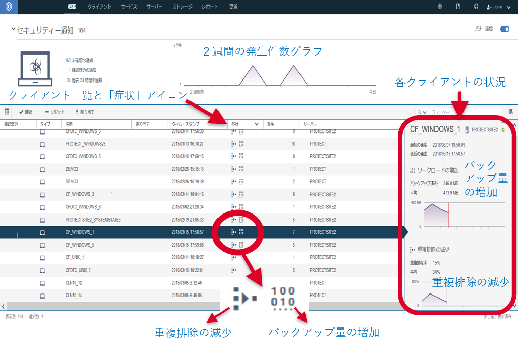 ランサムウェアに感染すると、ファイル数やデータ量が急増する一方本来増えるはずの重複排除率が逆に減少する、といった、通常では考えられない現象が見られます。