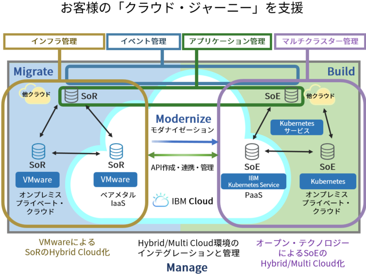 クラウド環境とオンプレミス環境/プライベートクラウドを併用するハイブリッドクラウド、もしくは複数のクラウド環境を併用するマルチクラウドで稼働する企業システムの一元管理を実現するためには、従来の SoR*1 システム、およびクラウド・ネイティブな SoE*2 システムを、シンプルに統合管理していくことが必要になります。